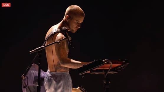 Justin Bieber returned to the stage after 4-year hiatus and performed at the 68th Grammys. Performing at Yukon, the singer's outfit consisted of only shorts. He stared into a large rectangular mirror with a guitar slung over his shoulder.